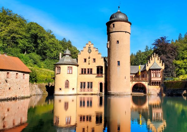 Lais Puzzle - Mittelalterliches Schloss Mespelbrunn in Bayern, Deutschland mit Spättagsreflexionen im Burggraben - 500 & 1.000 Teile