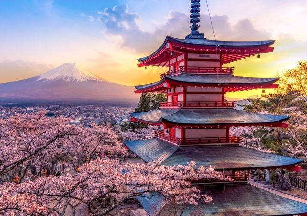 Lais Puzzle - Fujiyoshida, Japan Schöne Aussicht auf den Mount Fuji und die Chureito-Pagode bei Sonnenuntergang, Japan im Frühling mit Kirschblüten - 500 & 1.000 Teile