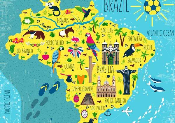 Brasilien illustrierte Landkarte, Südamerika, mit Wahrzeichen, Museum, Kirche, traditionellem Essen, brasilianischem Karneval, Tieren und Blumen