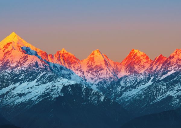 Sonnenuntergang auf dem Berggipfel Panchachuli im indischen Himalaya