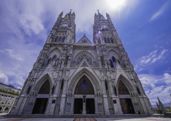 Schöne Fassade der Basilica del Voto Nacional Kirche in Quito, Ecuador