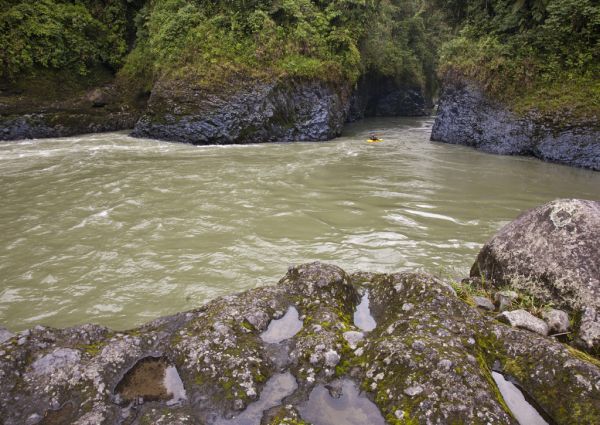 Ecuador. Einsamer Kajakfahrer auf dem Rio Quijos in den engen Wänden des El Chaco Canyons