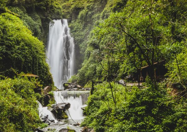 Cascadas de peguche,.ein kleiner Wasserfall in einer üppig grünen Umgebung in Ecuador, in der Nähe von Otavalo
