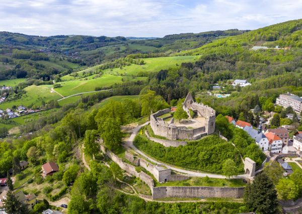 Luftaufnahme der Burg Lindenfels, Mittelalterliche Stadt Lindenfels, Bergstraße, Hessen, Deutschland