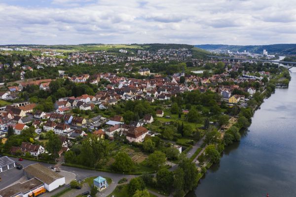 Blick aus der Vogelperspektive auf die Stadt Margetshöchheim und Veitshöchheim in Deutschland an einem sonnigen Tag im Frühling.