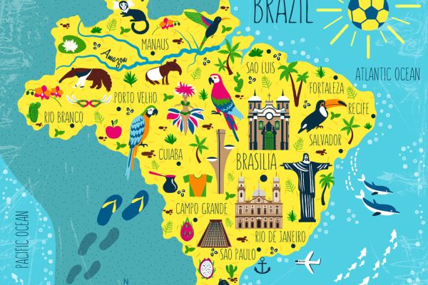 Brasilien illustrierte Landkarte, Südamerika, mit Wahrzeichen, Museum, Kirche, traditionellem Essen, brasilianischem Karneval, Tieren und Blumen