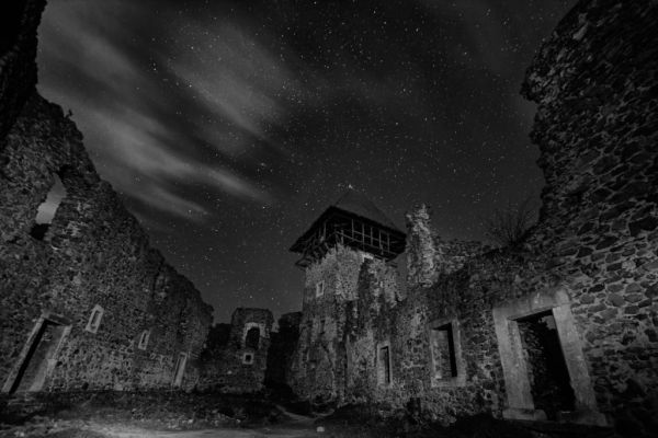 Ruinen von Nevitsky Castle in der Nähe von Uzhgorod, Ukraine mit vielen glänzenden Sternen am dunklen Himmel. Schwarz-Weiß-Version. Nevitsky Burg. Eines der ältesten Gebäude in den Unterkarpaten mit einer internationalen Bedeutung. Das Gebäude ist einzigartig in der Ukraine für sein elptychisches Design und erinnert an irische Schlösser.