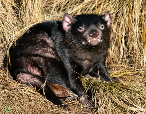 Tasmanischer Teufel, der im gelben Gras ruht Australien