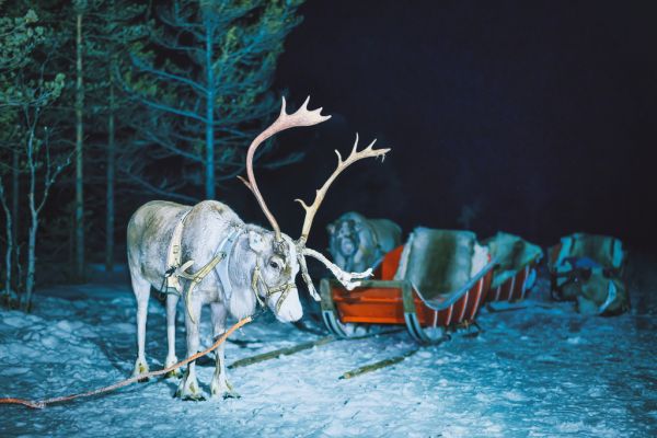 Rentiere in Finnland im lappländischen Winter bei Nacht Finnland