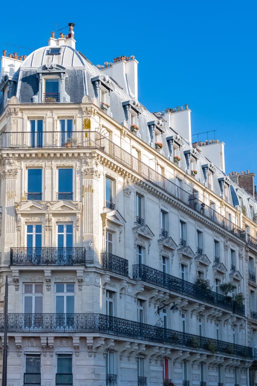 Paris, Pariser Fassade in einem schicken Viertel, typischer Balkon und Fenster in der Rue Montmartre Frankreich