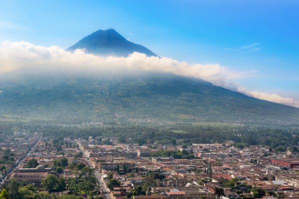 Panoramablick vom Cerro de la Cruz auf die Stadt Antigua, Guatemala und den Vulkan De Agua im Hintergrund Guatemala