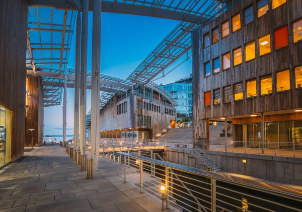 Oslo, Norwegen. Astrup Fearnley Museum für moderne Kunst, mehrstöckige Wohnhäuser in Aker Brygge Bezirk im Sommer Abend Norwegen