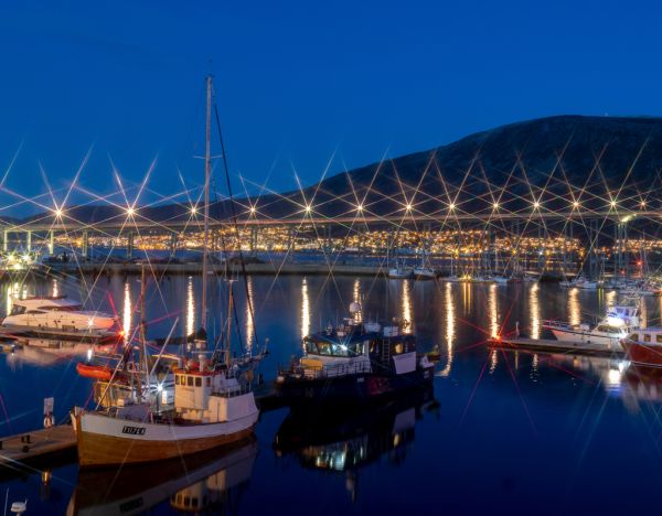 Blaue Stunde im Hafen von Tromsö mit der Brücke, Finnmark, Norwegen Norwegen
