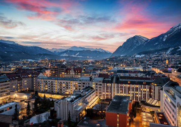 Panoramablick auf Innsbruck in den Alpen Österreichs im Winter am Abend nach Sonnenuntergang mit Schnee und Wolken Österreich