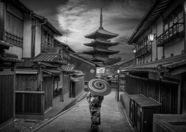 Lais Puzzle - Asiatische Frauen in traditionellen japanischen Kimonos bei der Yasaka-Pagode und in der Sannen Zaka-Straße in Kyoto, Japan in schwarz weiß - 500, 1.000 & 2.000 Teile