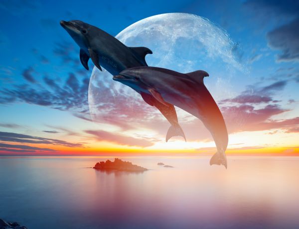 Springende Delfine vor Mond