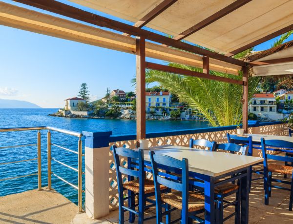 Lais Puzzle - Blaue Stühle mit Tischen in einer traditionellen griechischen Taverne im Hafen von Fiskardo, Insel Kefalonia, Griechenland - 1.000 Teile