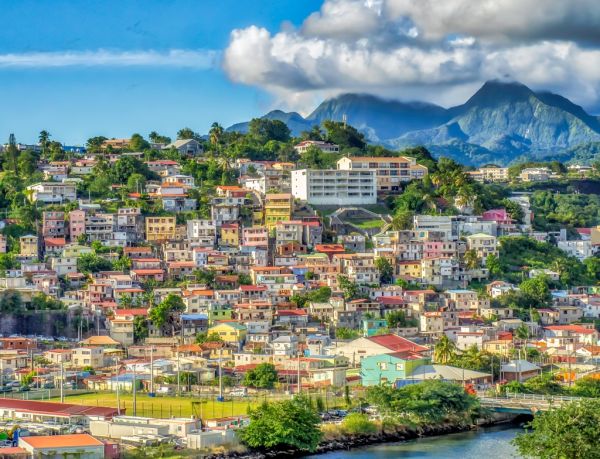Blick vom Meer von Häusern auf Hügeln in Fort-de-France, Hauptstadt von Martinique, einem überseeischen Departement von Frankreich