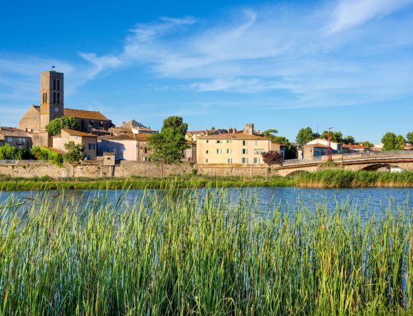 Frankreich, Trebes, in der Nähe von Carcassonne: Panorama-Skyline-Ansicht der französischen Kleinstadt mit Fluss Aude, Kirche Saint Etienne, grünem Schilf, Stadtbild, Brücke und blauem Himmel im Hintergrund